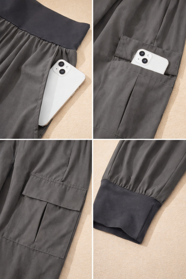 These high-waisted cargo joggers feature a flattering elastic waistband, functional side pockets, and a relaxed tapered leg with cuffed ankles. Lightweight, breathable, and designed for real life — school runs, errands, travel days, and everything in between.