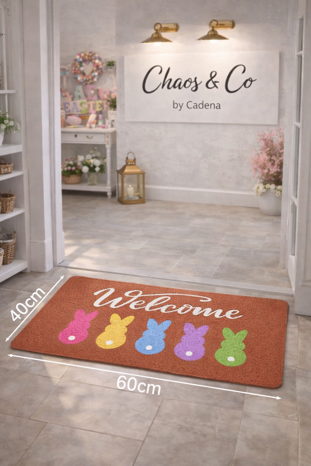 Our Blush & Bunnies Welcome Mat features a warm chestnut base with playful pastel bunny silhouettes and a bold “Welcome” script that makes your front door instantly festive.